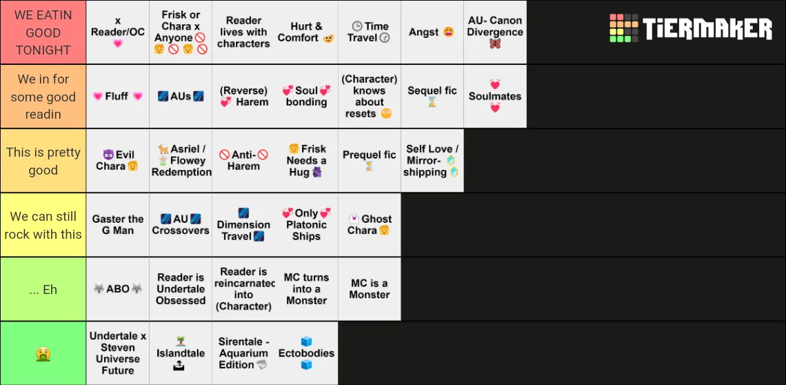 The fanime Underverse popularised the grouping of "good" and "evil" Sanses, too. Lots of people on my side of AO3 are especially enamoured by the bad guys. I see them shipped with each other, as a harem for the reader-insert, or both at once. I'd join the fun if I was more interested in the interdimensional-crossover multiverse-travel thing that's so beloved these days. It's not my thing, but I'm not knocking it, either. The world runs on pleasures as simple as recolouring Sans the Skeleton, changing his whole personality, and mashing all the new characters together.