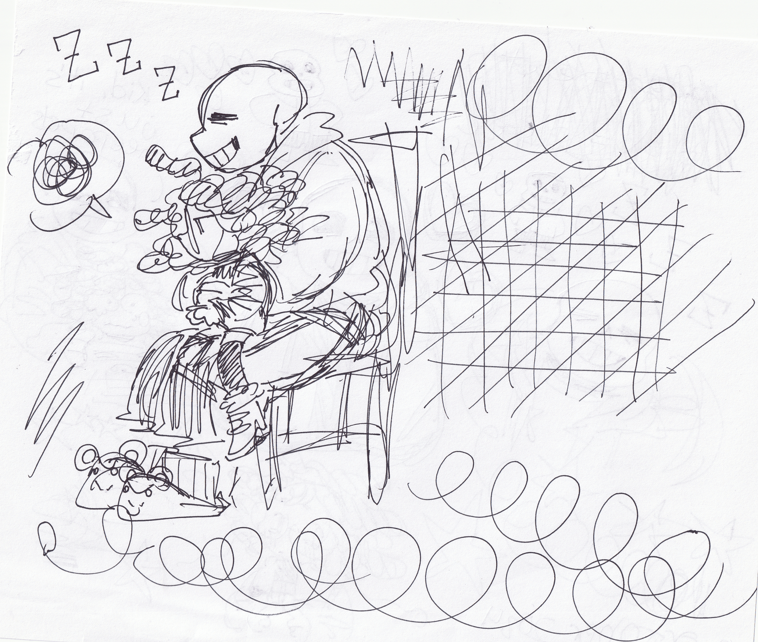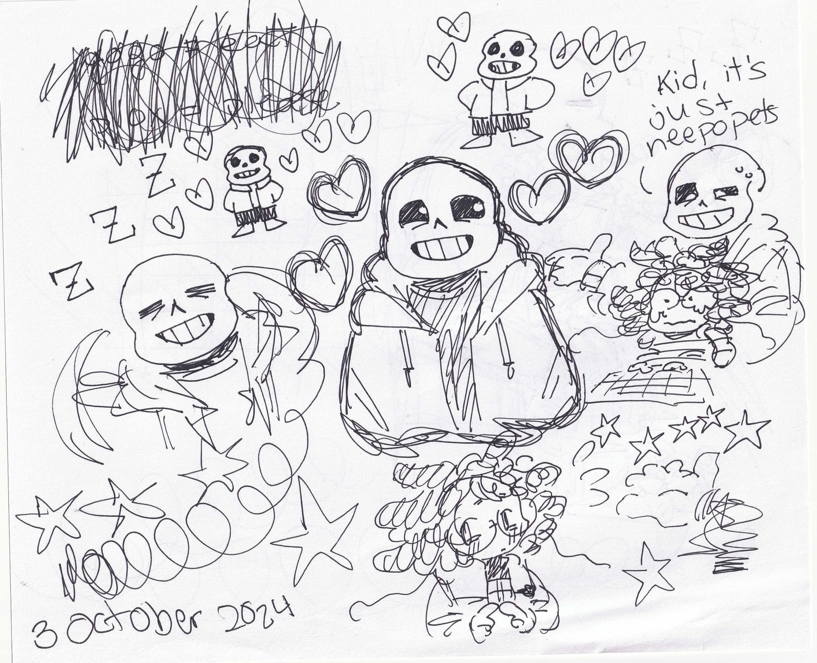 First of all, Sans is the kind of guy who likes to hang out and shoot the shit. He loves to make people laugh and have a good time. I think the key to his heart is just being around him. He gets along well with everyone, so unless you've got some kind of crazy conflict, he's going to appreciate your company! I love to just lounge around with him, cuddling and talking. Sometimes we sit at my desk (he's in my chair and his lap is my throne) and, over my shoulder, he watches me write or draw or play games. Here are some doodles I made of us while I was learning to play Neopets (stressful...)